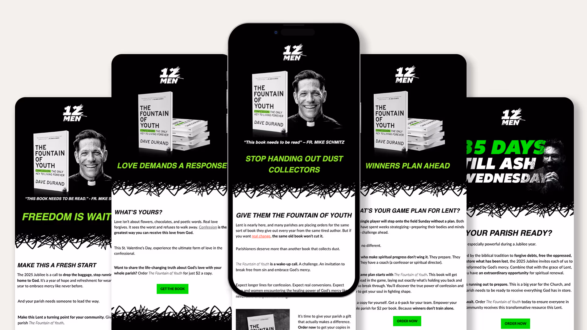 Our team strategized and deployed targeted digital advertising and email campaigns to spread the word about The Fountain of Youth and the 12 Men movement. These efforts created strong momentum, driving awareness, engagement, and the distribution of more than 180,000 books. After feeling inspired by the message, individuals ordered 6-packs to share with friends and family, parishes gave out copies for Advent or Lent, and conferences offered copies to attendees. We are honored to have helped spread this movement far and wide.